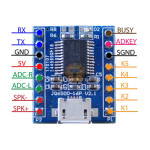 JQ6500 MP3 Voice sound module can play stereo MP3 files or standard mono audio files. The module has two different modes to operate in; serial communication mode (connecting to a microcontroller) or AD button control mode (module can be controlled with switches). If has an 2MB onboard flash memory which can store many MP3 files (probably reduced quality) via its USB port.